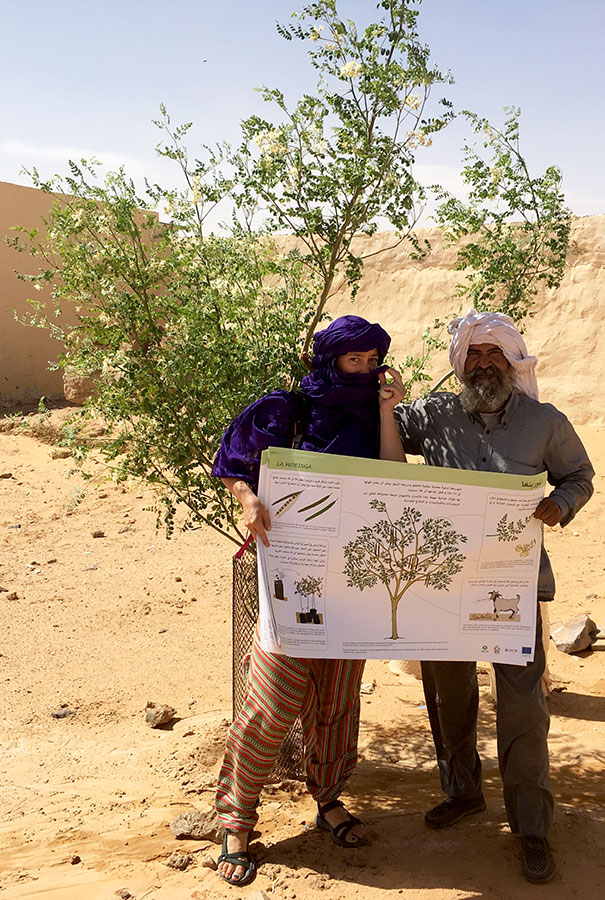 Este árbol, de rápido crecimiento, se ha ido introduciendo con éxito en los huertos familiares, partiendo de una producción experimental exitosa en 2014 en la que participaron 400 familias. El polvo de moringa que se obtiene tras secar y moler las hojas se puede usar como sazonador en las comidas, mientras que los frutos y las ramas se pueden emplear como complemento de la dieta del ganado, hecho muy valorado por las familias saharauis.