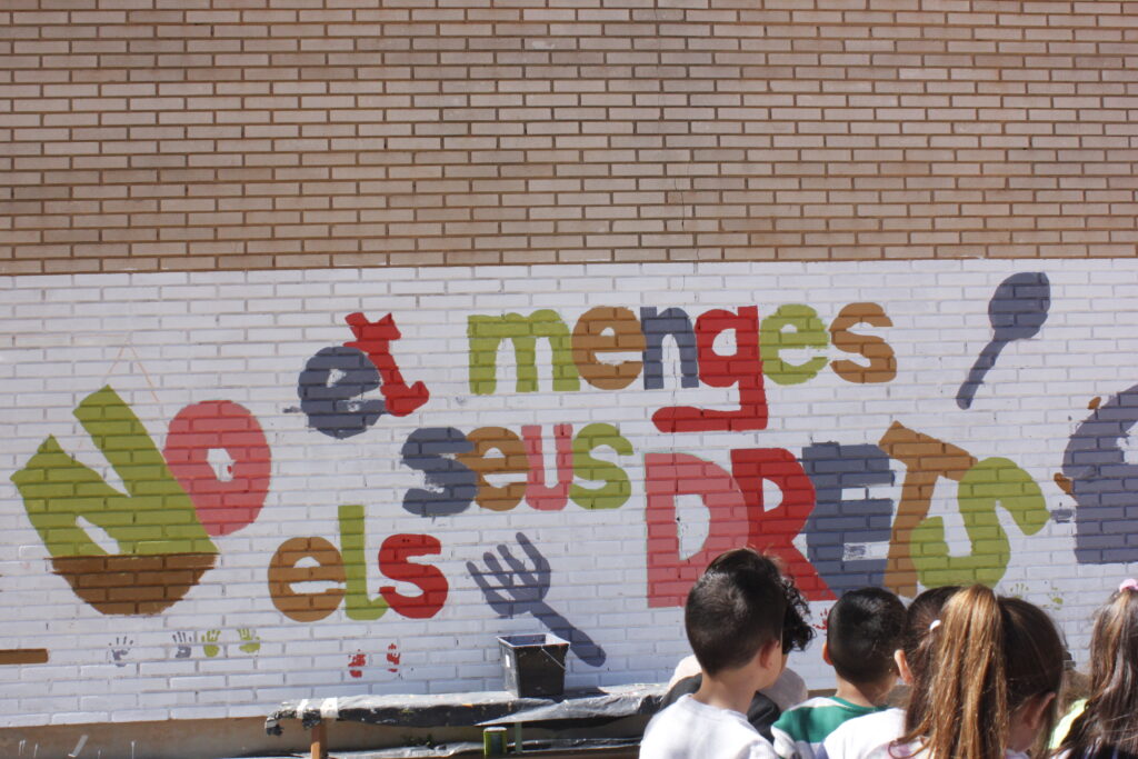 Además de firmar el manifiesto impulsado por ambas organizaciones, la SAT, en colaboración con CERAI, promovió en el CEIP Benimámet, uno de los 48 centros educativos que forman parte de la red Horta-cuina, abastecida con productos locales y de temporada, una iniciativa artística desarrollada junto al alumnado del centro. Esta consistió en la pintura colectiva, junto a estudiantes de 5º y 6º de primaria, de un mural bajo el lema “No et menges els seus drets”. Con esta acción creativa pretenden reivindicar unas condiciones dignas para agricultoras y agricultores.