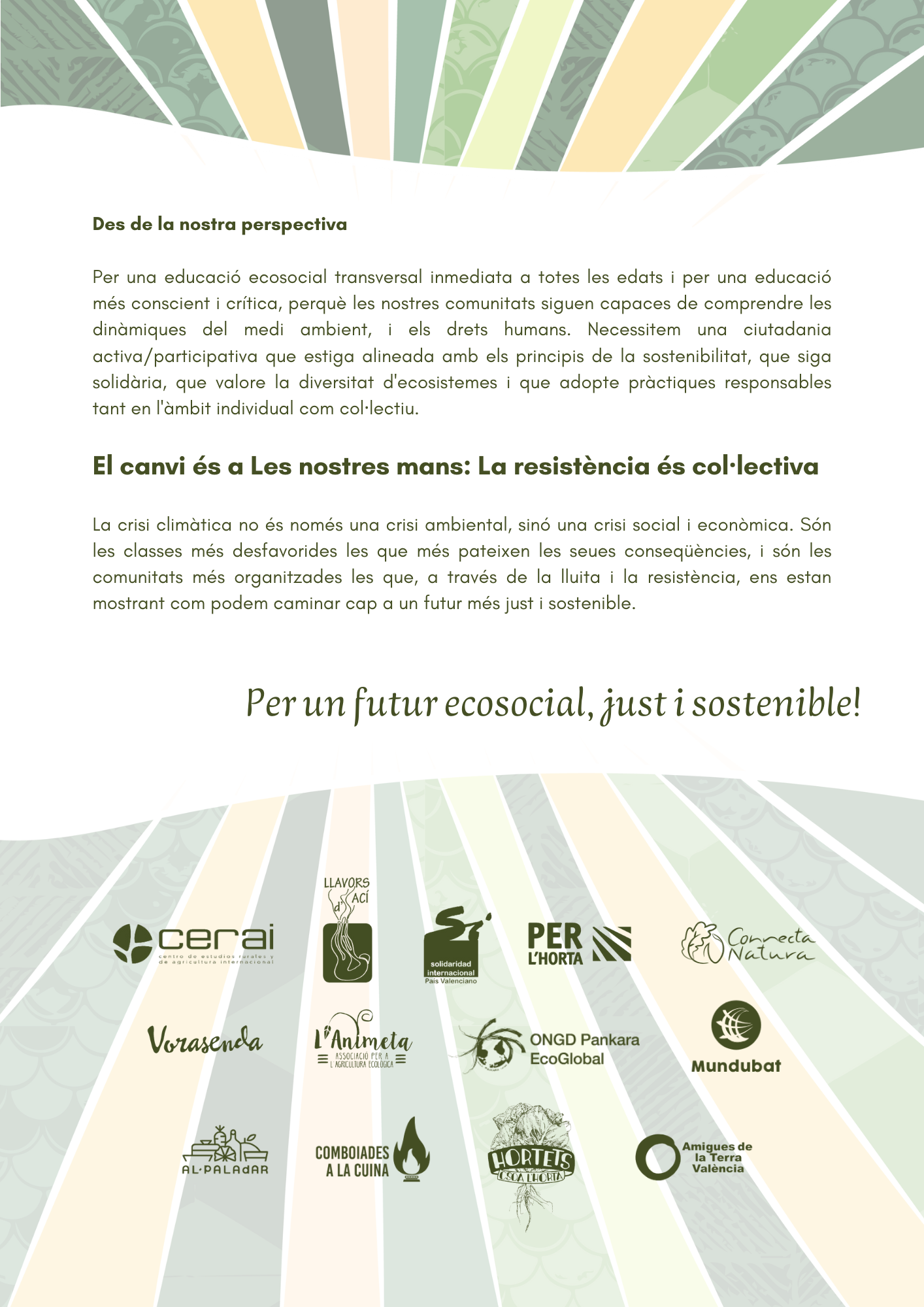 Davant aquesta realitat que ha colpejat especialment al País Valencià, un grup d’entitats llancen un manifest sota el lema ‘L’acció és el nostre futur’ per a expressar la seua solidaritat amb les persones víctimes. Les entitats i col·lectius que formem part d’aquest manifest: Llavors d’Ací, ONGD Pankara Ecoglobal, ONGD CERAI, Per l’Horta, Solidaridad Internacional, L’Animeta Associació per a l’Agricultura Ecològica, Vorasenda, Col·lectiu Hortets del CSOA l’Horta i Connecta Natura, Mundubat, Amigues de la Terra València, Al-paladar i Comboiades a la cuina.