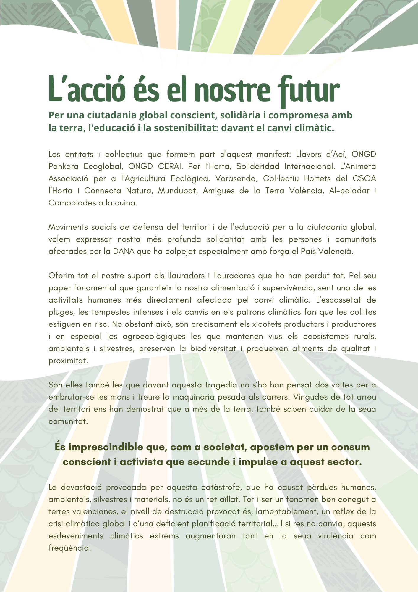 En el marco de este escenario, CERAI trabaja en el proyecto Sembrando Resiliencia y Soberanía Alimentaria tras la DANA, financiado por la Generalitat Valenciana. El objetivo de este es sensibilizar a la comunidad educativa y a la ciudadanía valenciana sobre la necesidad de transitar hacia una sistema alimentario sostenible, basado en la soberanía alimentaria y alineado con los ODS. El fin último es promover valores, actitudes y conocimientos orientados a la resiliencia climática y a la mitigación de los impactos del actual modelo agroalimentario en el contexto posterior a la DANA en los municipios afectados.