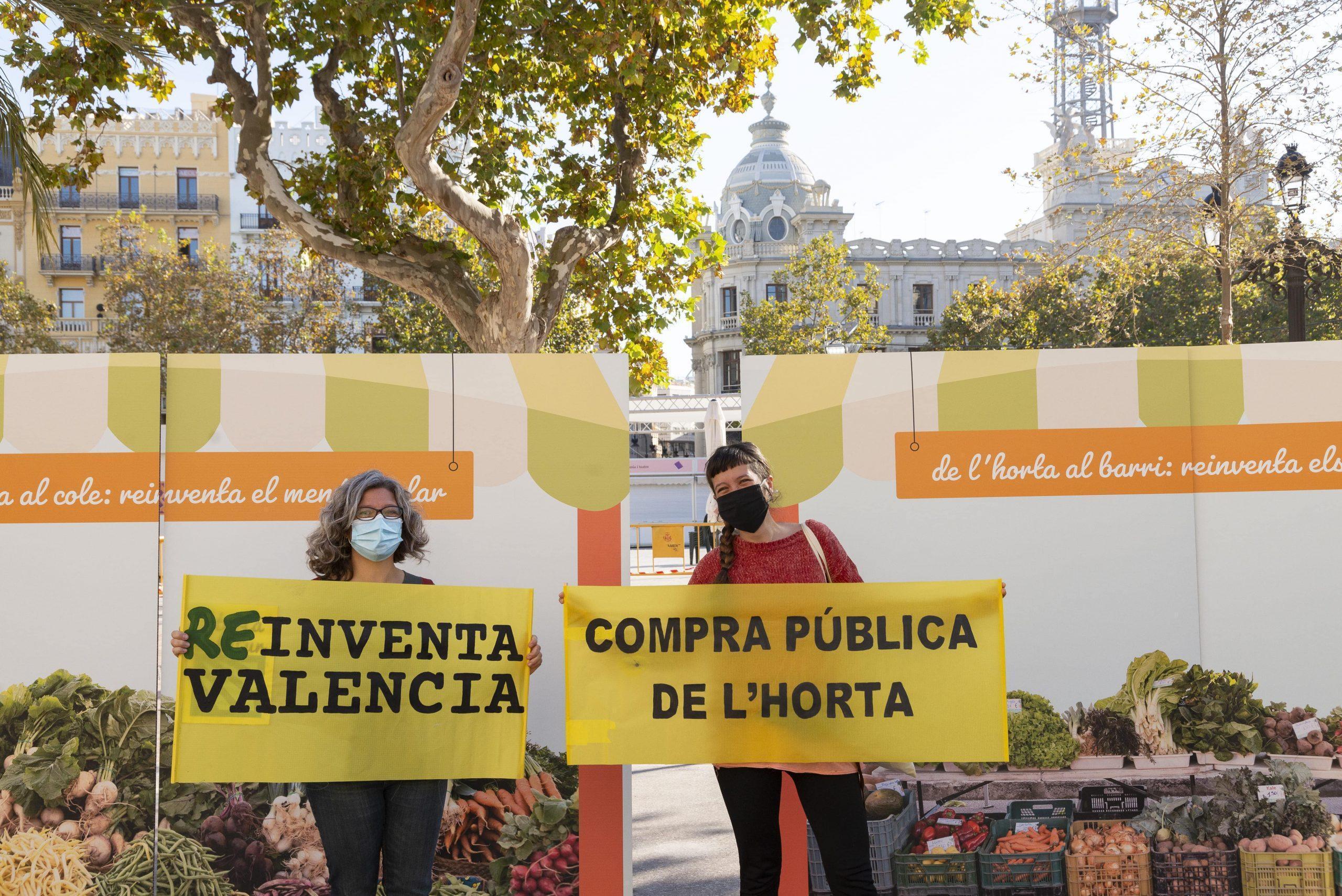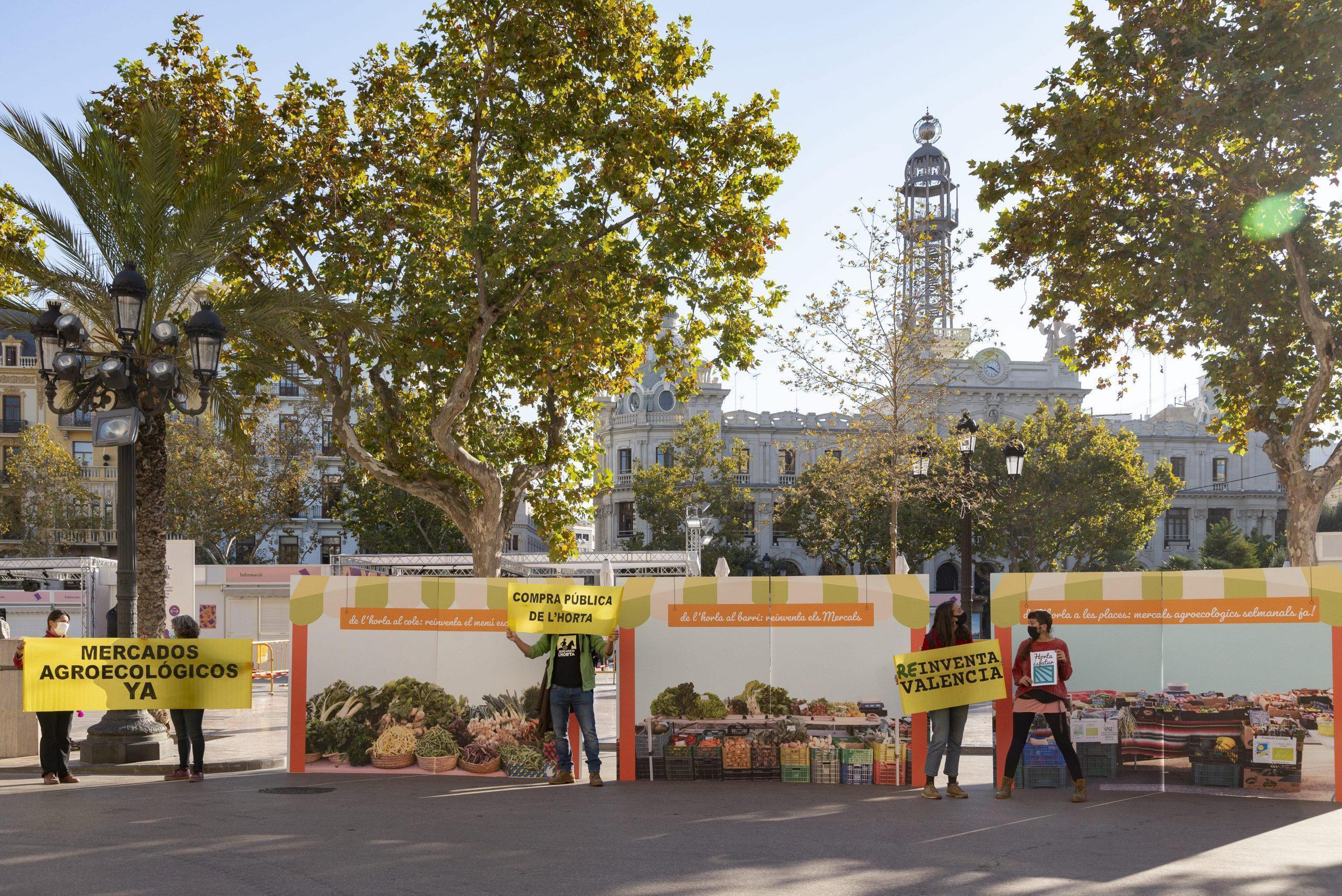 Esta mañana la plaza del Ayuntamiento de Valencia ha amanecido con tres grandes puestos de frutas y verduras en cartón pluma, representando un mercado agroecológico, para exigir un modelo de alimentación sostenible para la ciudad.